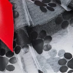 - Has tutus at the neck and paws with flocked paw-print pattern, tulle ruffle detailing, and a red bow at the collar.