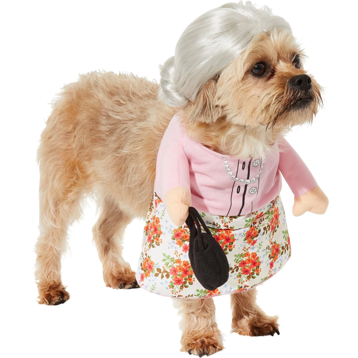 - This super cute front-walking costume turns your pet into a grandma, complete with a grey-haired ponytail wig.