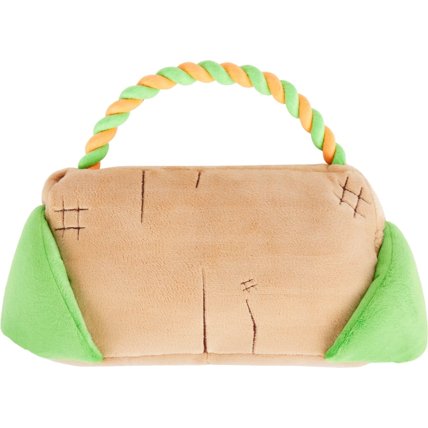 - This plush squeaky dog toy features a “Will do tricks for treats” sign with a textured rope handle and four squeakers to upgrade your pup’s playtime.