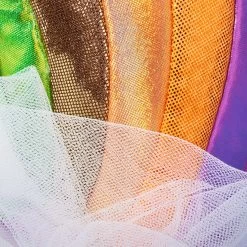 - Soft, plush rainbow stripes at the back are removable and feature a multicolored metallic fabric with fluffy tulle clouds at each end.
