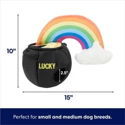 - Each toy and the cloud at the end of the rainbow have a squeaker and crinkle paper to keep your pup focused on the fun.