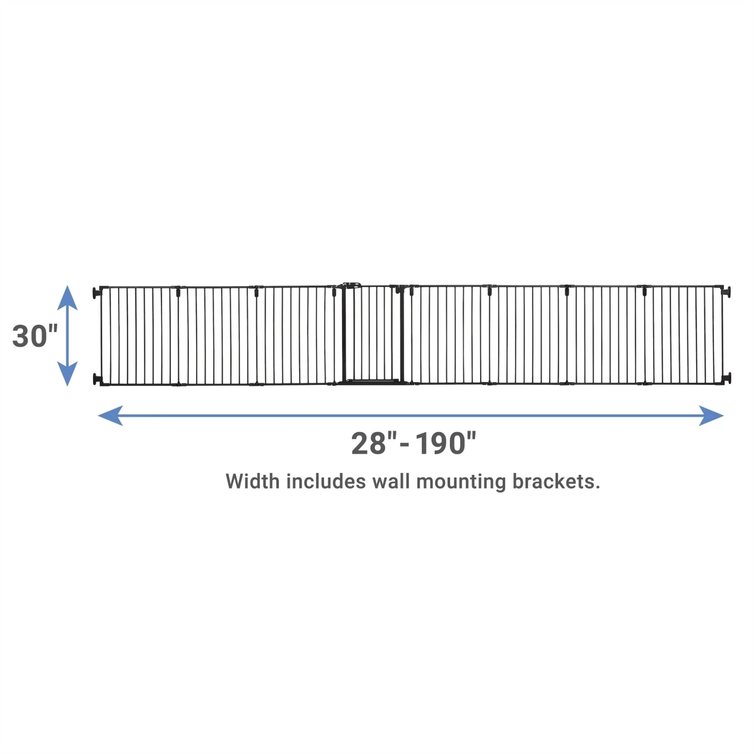 - Each 30-inch-tall panel has a powder-coated finish and features easy-press buttons that allow you to quickly remove panels and tailor the gate to your needs. Gate measures 186.5 inches without mounting brackets or 190 inches with brackets.