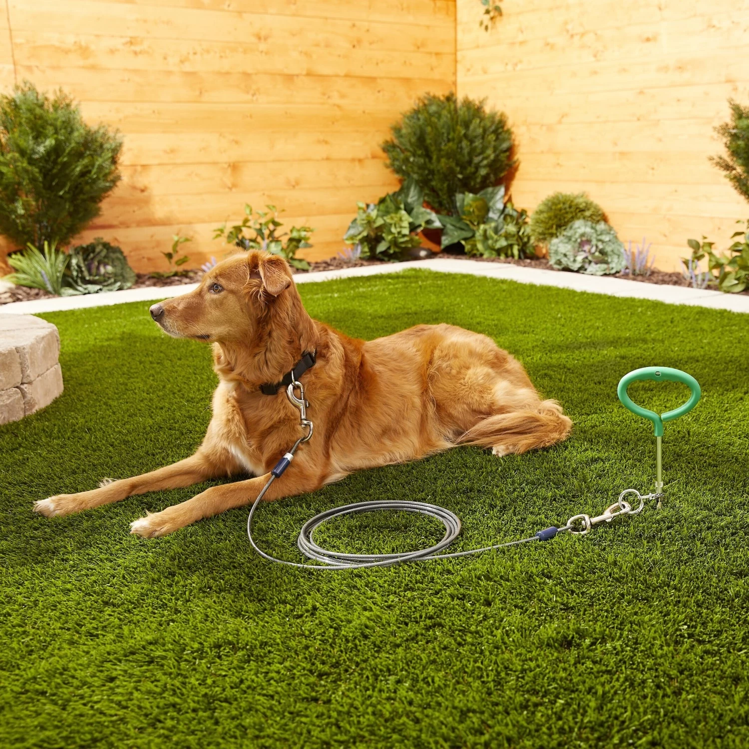 - Easy to use by clipping one of the metal swivel clips to your dog’s collar, and the other to a stake (not included).