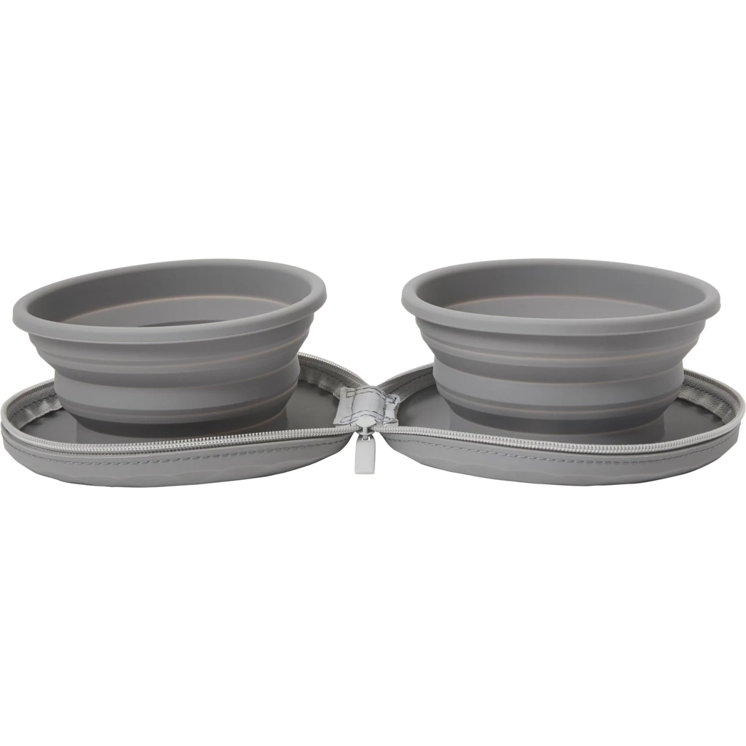 Frisco Travel Collapsible Silicone Dog & Cat Bowl, Gray, Large, 3 Cups — Take mealtime anywhere with the Frisco Travel Collapsible Dog Bowl. This two-in-one set features two pop up bowls that collapse, fold up and zip shut for compact and convenient storage.